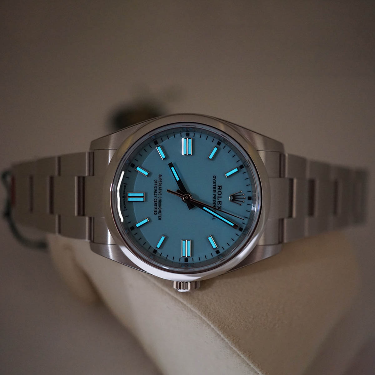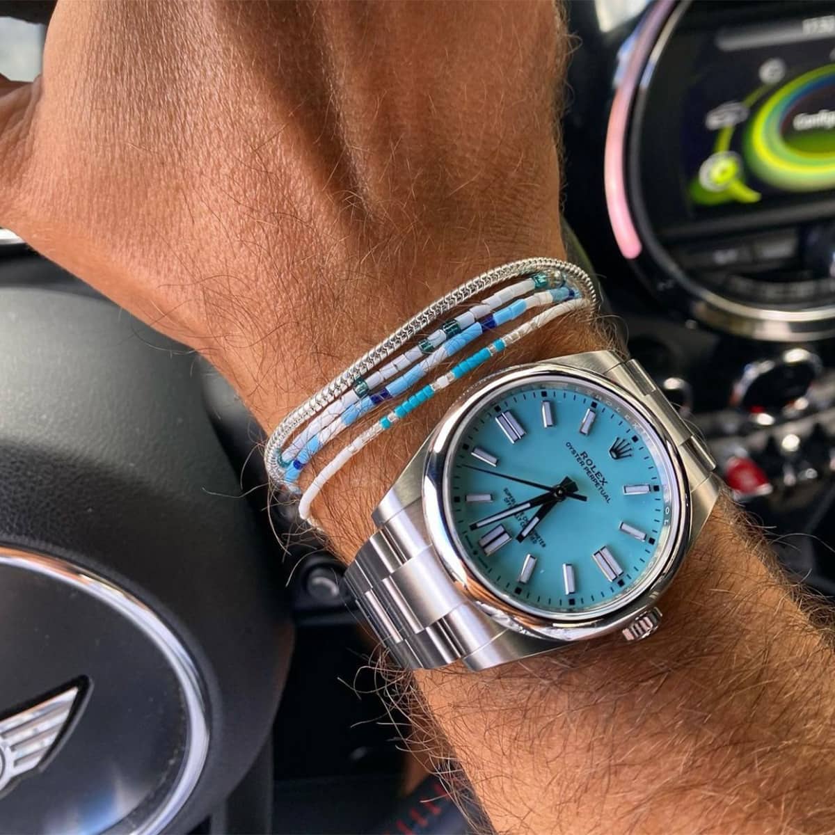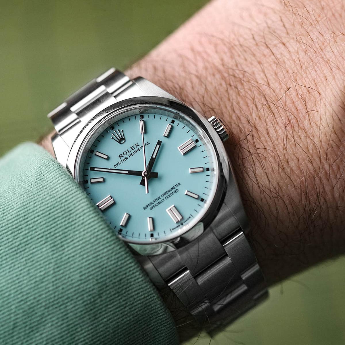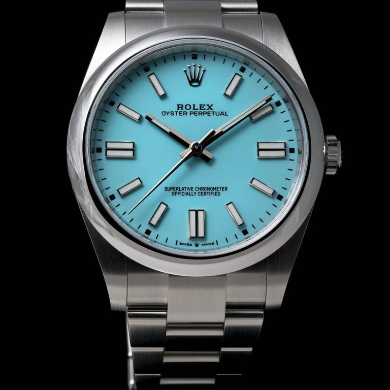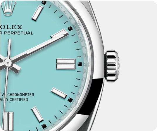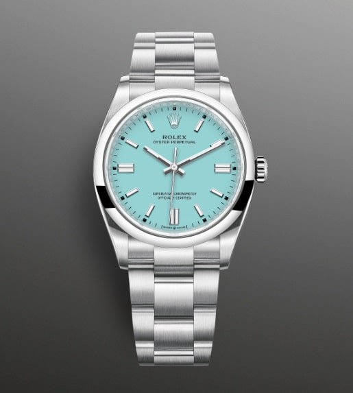 قاب ساعت رولکس مردانه فیروزه ای مدل OYSTER PERPETUAL از استیل اویستر ساخته شده است که فقط برند رولکس آن را به صورت انحصاری تولید می کند.