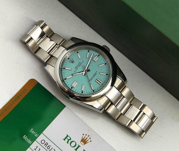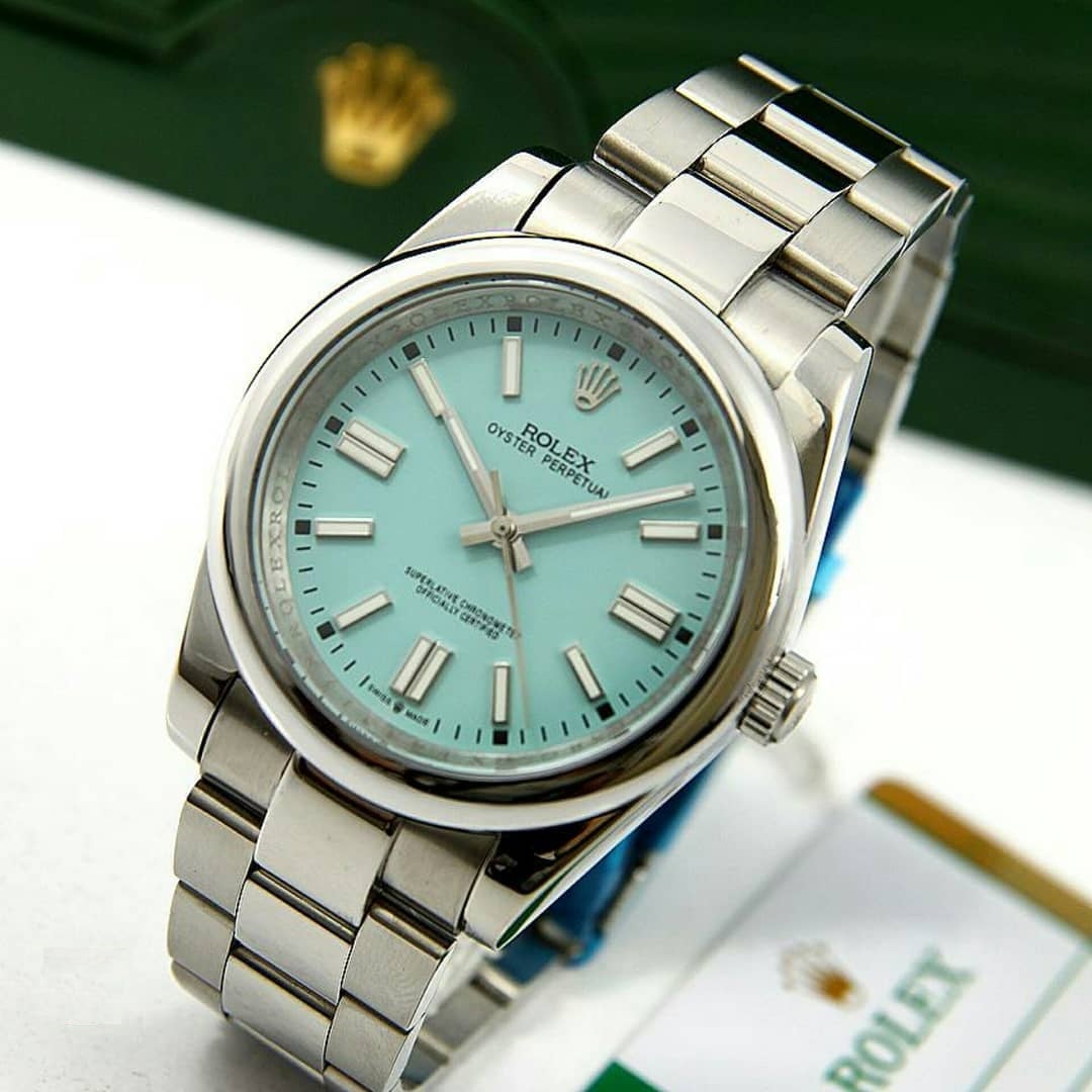 ساعت رولکس مردانه فیروزه ای مدل OYSTER PERPETUAL با بهره گیری از متخصصین زیبایی شناختی و استفاده از بهترین طراحان با حفظ اصول سنتی طراحی برند رولکس از زیباترین و بهترین ساعت های دنیا می باشد.